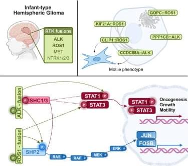 Postlmayr et al. show that ALK and ROS1 fusions identified in IHG drive increased STAT3 and SHP2 signaling, revealed by multi-omic integrative analyses and validated in vitro and in vivo. Distinct microtubule-binding fusion partners further promote a hypermotile, invasion-prone phenotype, highlighting the role of fusion partners in specific tumorigenic behavior.