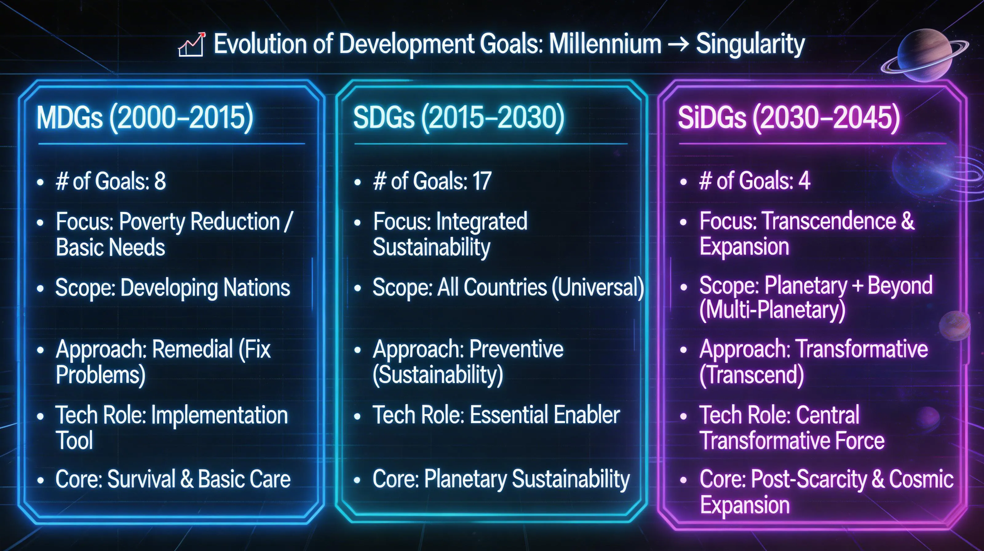 The progression from MDGs to SDGs to SiDGs represents not merely an expansion of goals but a fundamental reconceptualization of human potential and purpose. The MDGs addressed immediate suffering through incremental improvement. The SDGs recognized systemic interconnections and the need for sustainability. The SiDGs embrace the possibility of transcending historical constraints through exponential technologies, while acknowledging that such power must be wielded wisely and equitably.